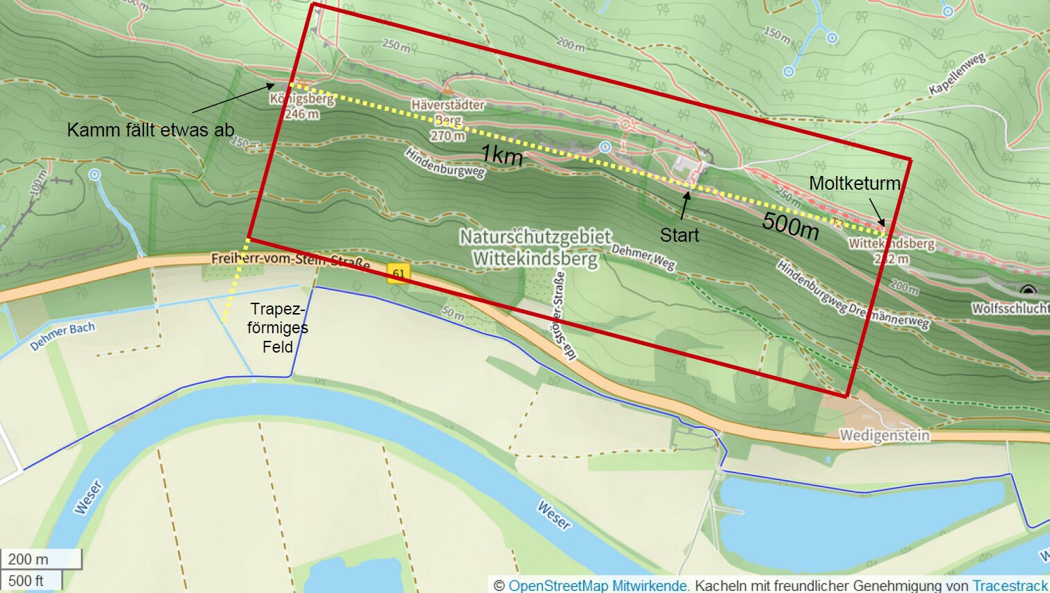 Von Startrampe aus: 1000m in westlicher, 500m in östlicher Kammrichtung.